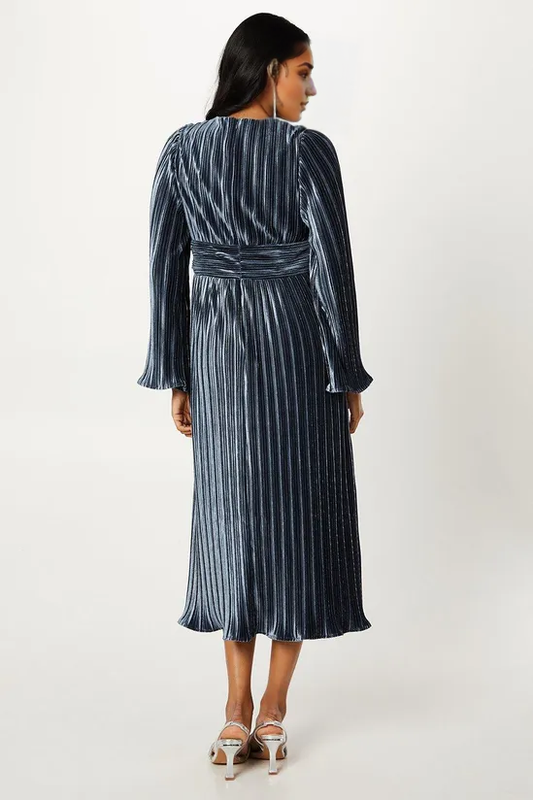 Pleated Velvet Long Sleeve V-Neck Pencil Dress Wedding Guest Dresses