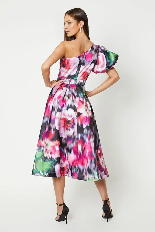 Printed One Shoulder Puff Sleeve Tea length Midi Dress Wedding Guest Dresses