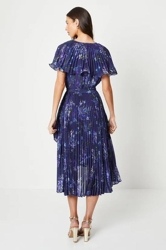 Pleated Cape Midi Dress With Tie Waist Chiffon A-Line Mother of the Bride Dresse Wedding Guest Dresses