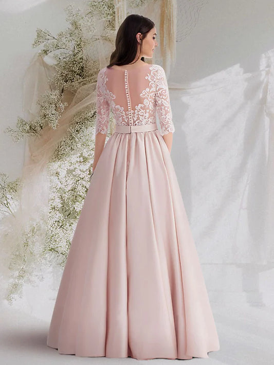 Princess Cute Engagement Prom Dress Jewel Neck Half Sleeve Floor Length Satin with Pleats Lace Insert