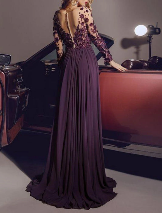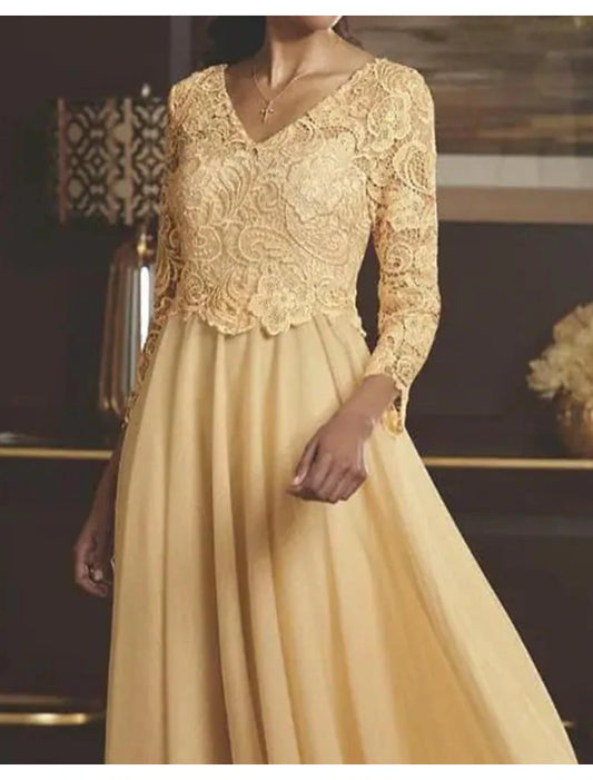 A-Line Mother of the Bride Dress Wedding Guest Elegant V Neck Sweep / Brush Train Chiffon Lace Long Sleeve No with Appliques Solid Color