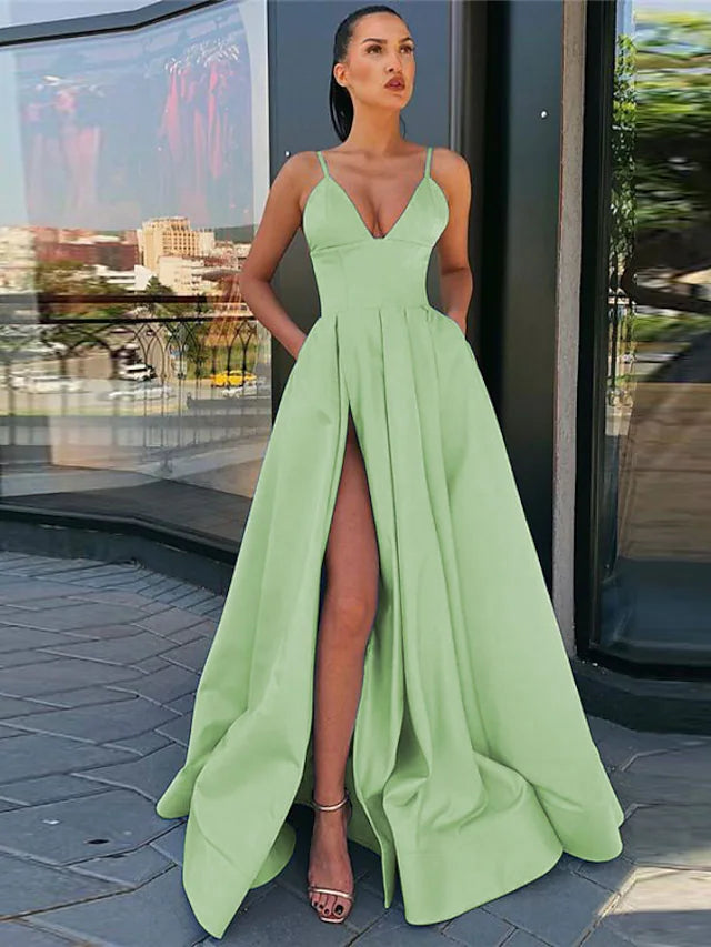 A-Line Black Prom Dress High Split Evening Dress Formal Birthday Summer Dress Spaghetti Strap Sleeveless Satin with Pleats Split Front