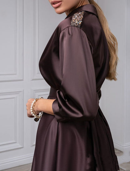 A-Line Cocktail Dresses Elegant Dress Wedding Guest Evening Party Tea Length 3/4 Length Sleeve Shirt Collar Satin with Pleat
