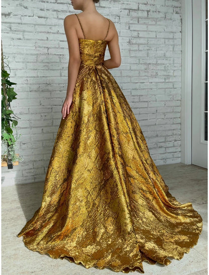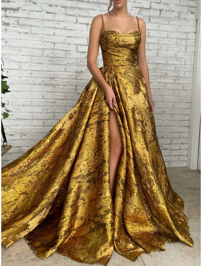 A-Line Evening Gown High Split Dress Formal Christmas Court Train Sleeveless Spaghetti Strap Sequined with Glitter Pleats Ruched