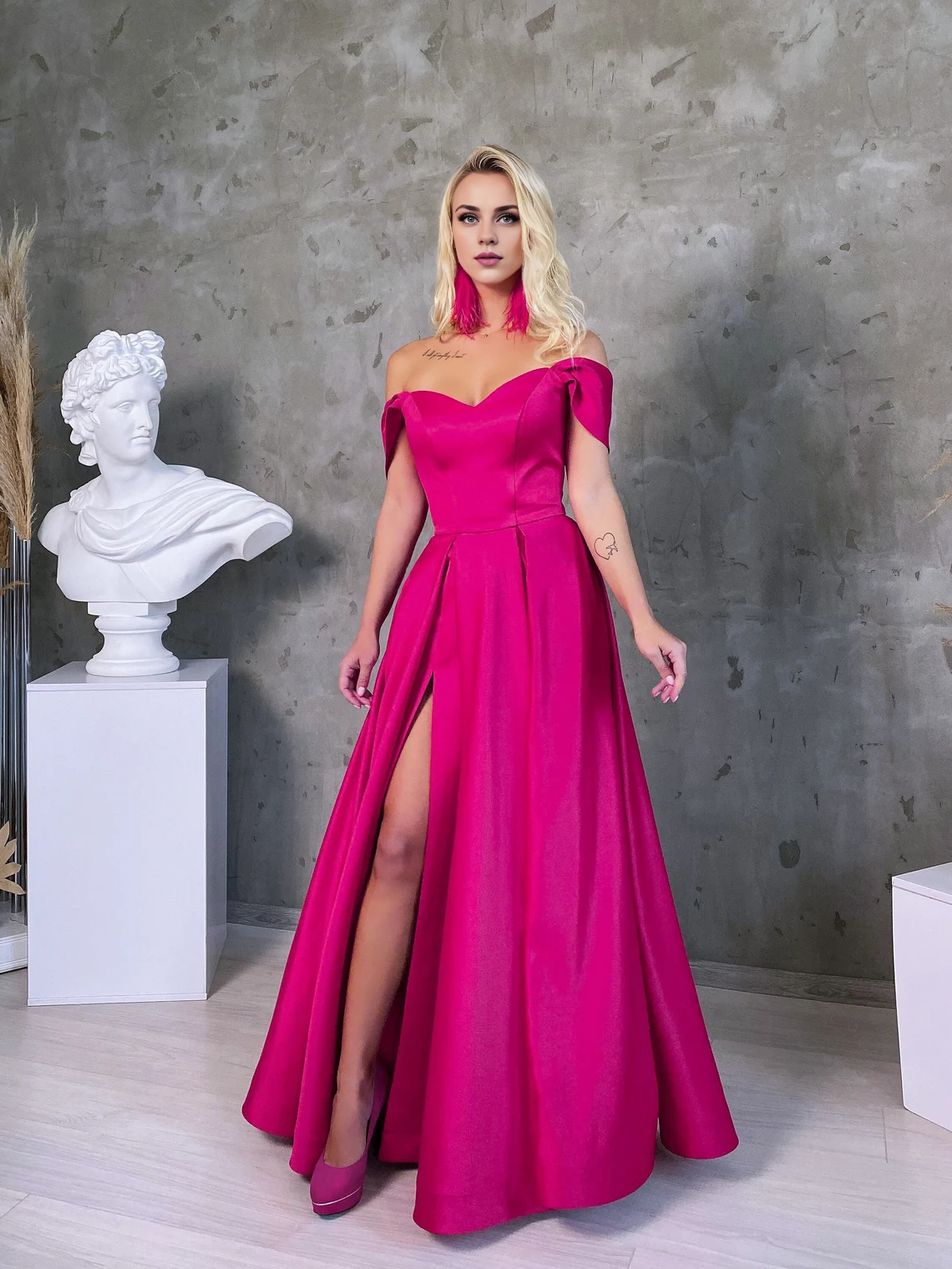 A-Line Fuchsia Satin Bridesmaid Dress Simple Off Shoulder Long Wedding Guest Party Dresses