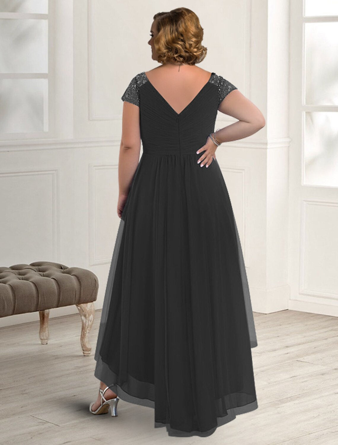 A-Line Mother of the Bride Dress Plus Size Elegant High Low V Neck Asymmetrical Floor Length Chiffon Short Sleeve with Pleats Beading