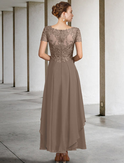 A-Line Mother of the Bride Dress Plus Size Elegant V Neck Ankle Length Chiffon Lace Short Sleeve with Appliques