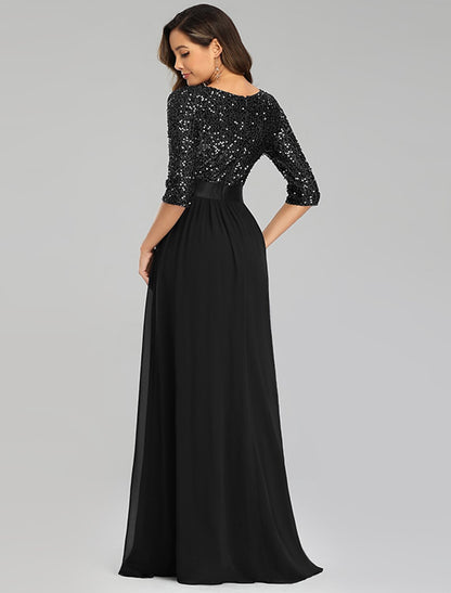 A-Line Mother of the Bride Dress Wedding Guest Plus Size Elegant Jewel Neck Floor Length Tulle Sequined 3/4 Length Sleeve with Sequin Fall