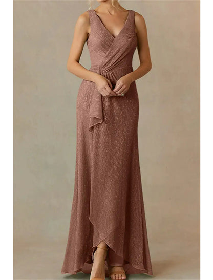 A-Line Mother of the Bride Dress Wedding Guest Sparkle & Shine Elegant V Neck Floor Length Polyester Sleeveless with Split Front Side-Draped