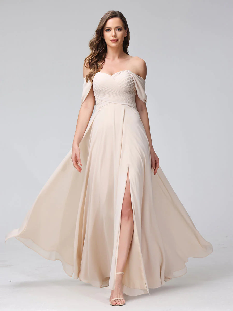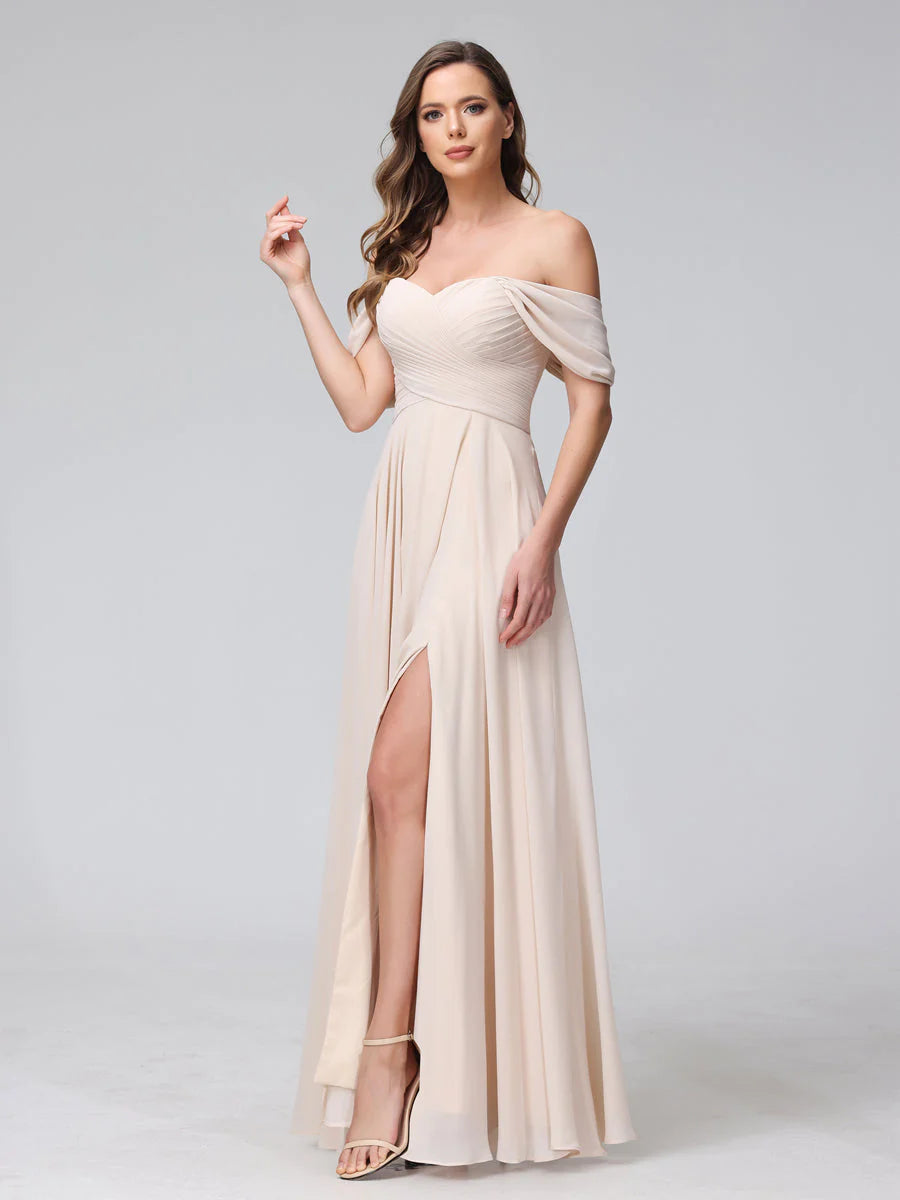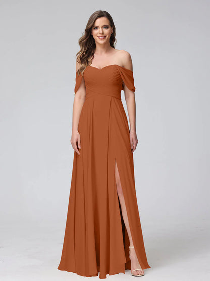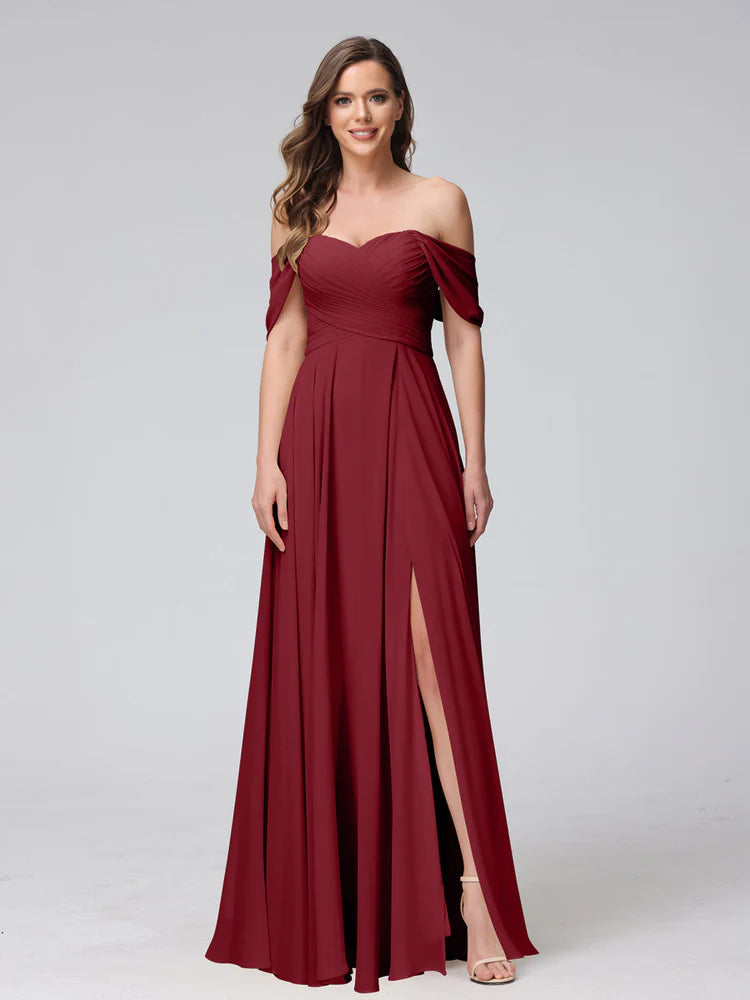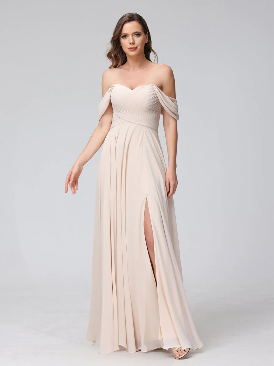 A-Line Off-The-Shoulder Sleeveless Ruched Long Chiffon Bridesmaid Dresses With Split Side