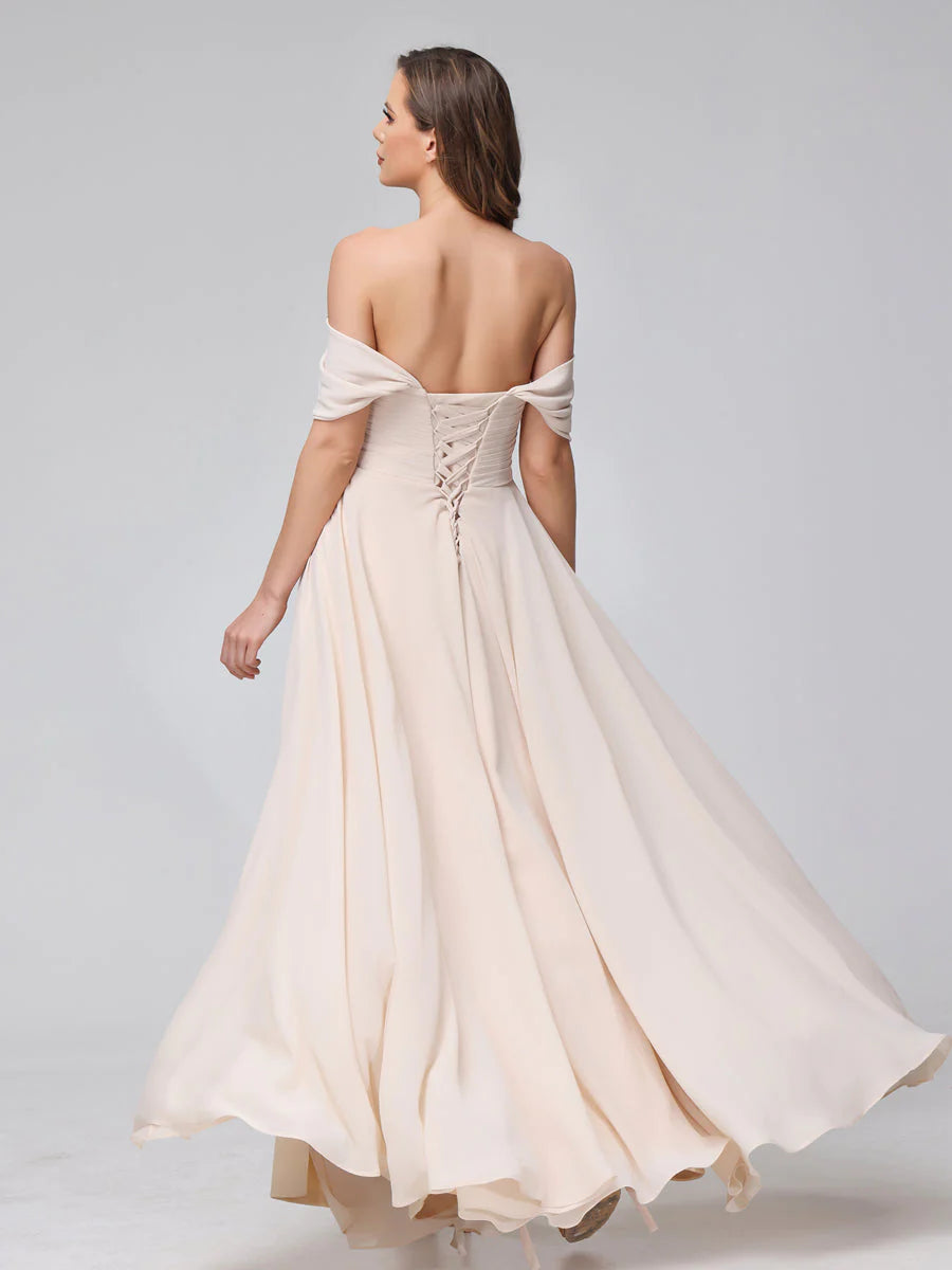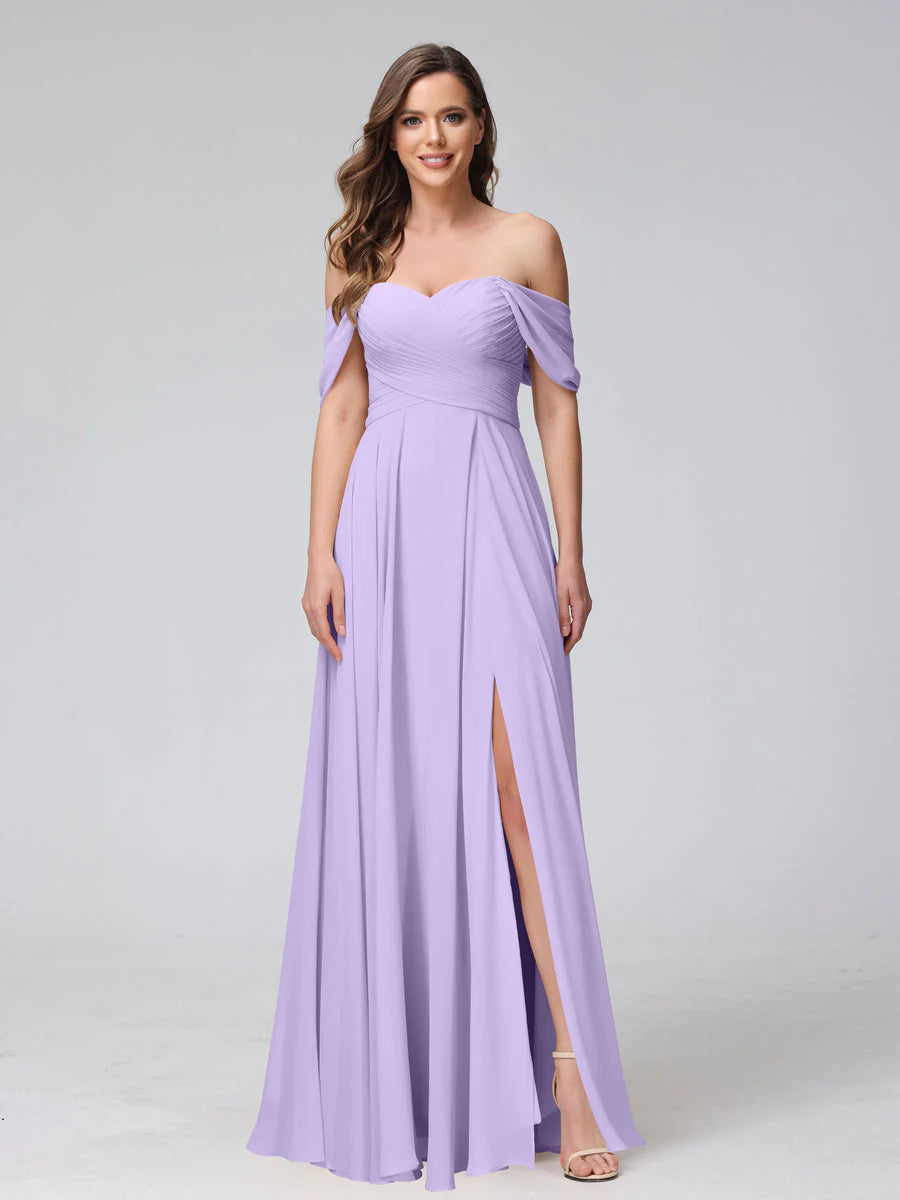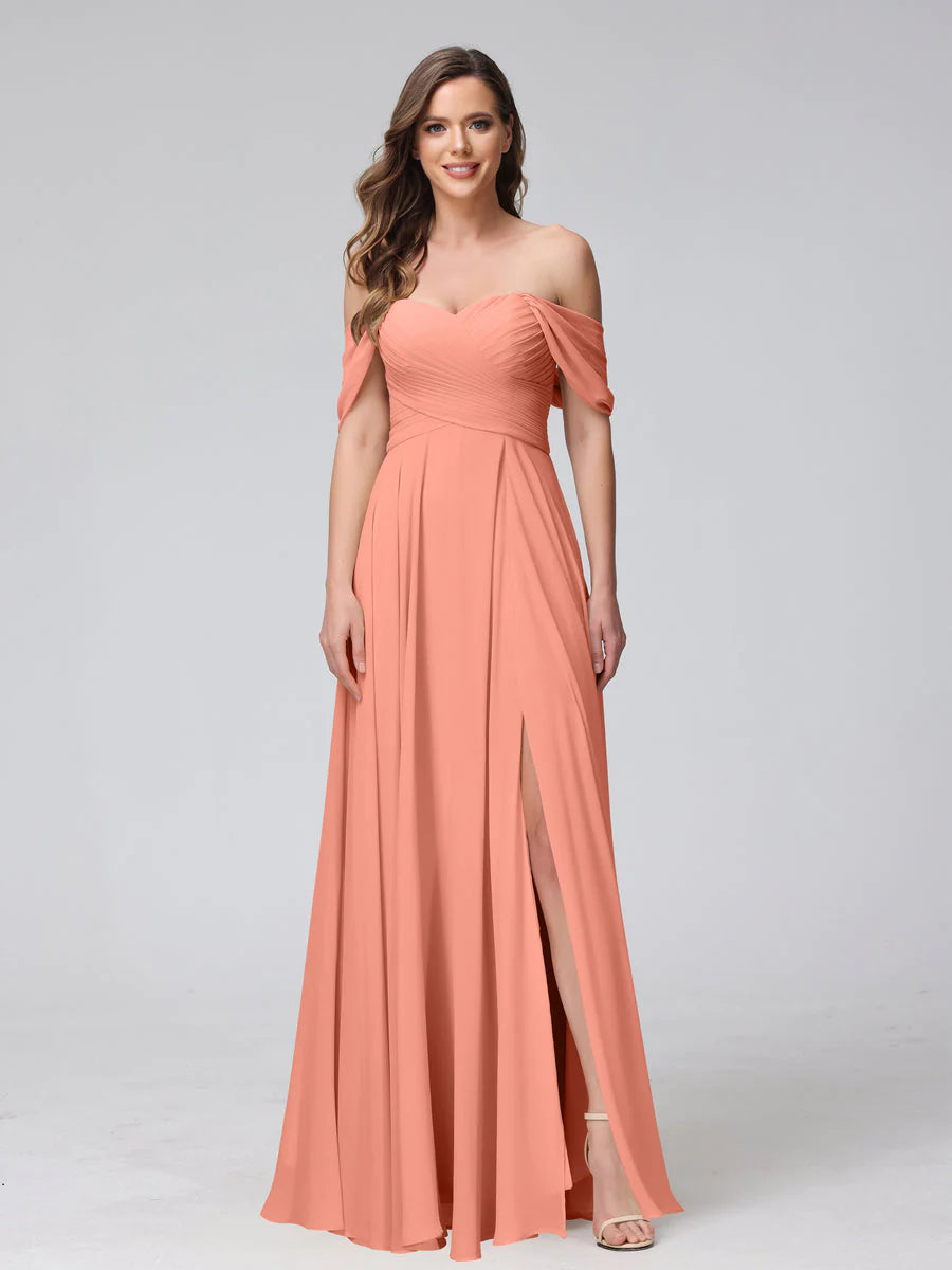 A-Line Off-The-Shoulder Sleeveless Ruched Long Chiffon Bridesmaid Dresses With Split Side