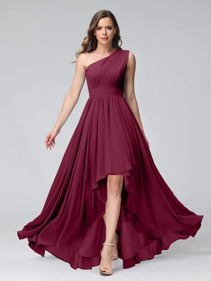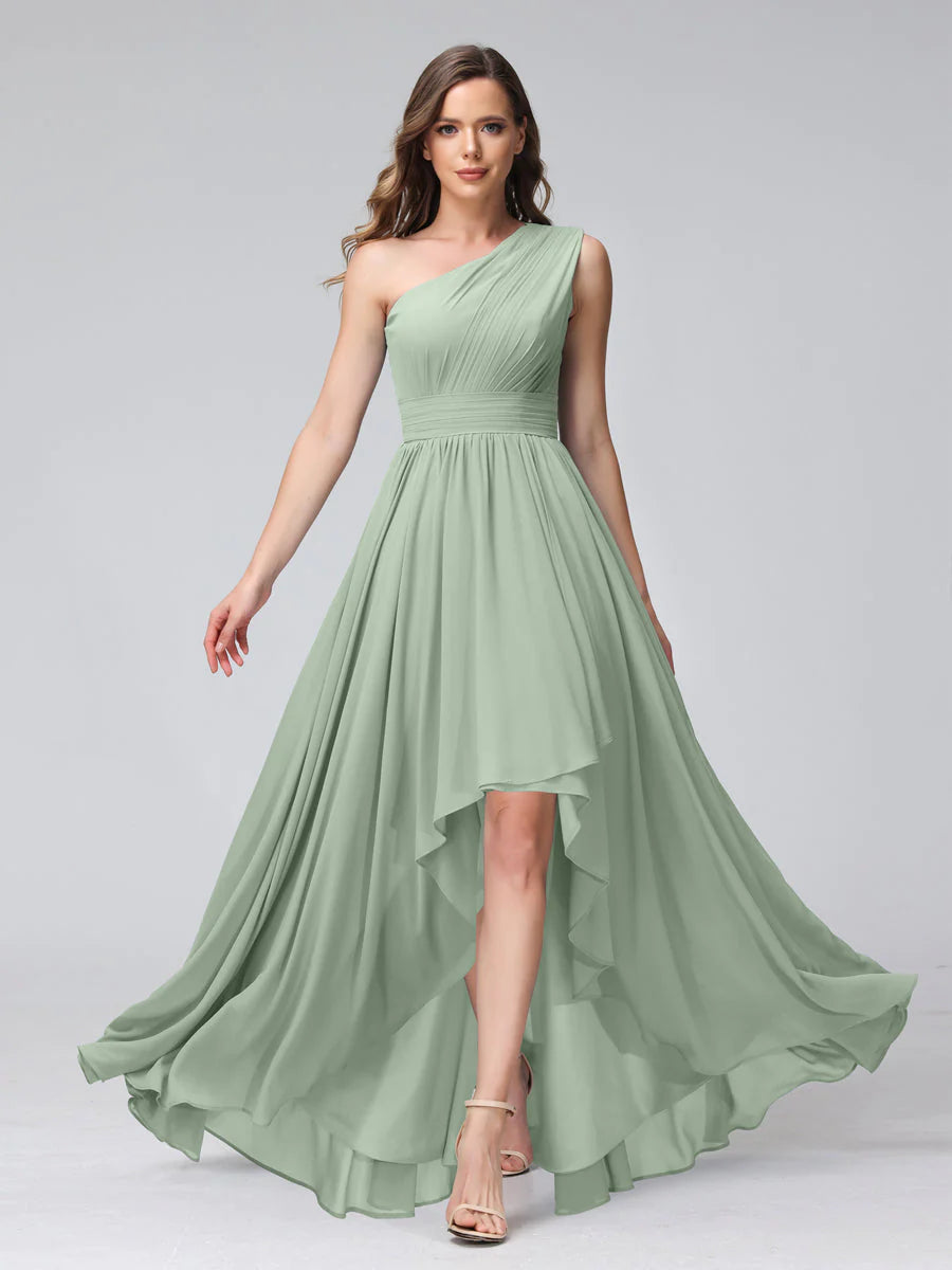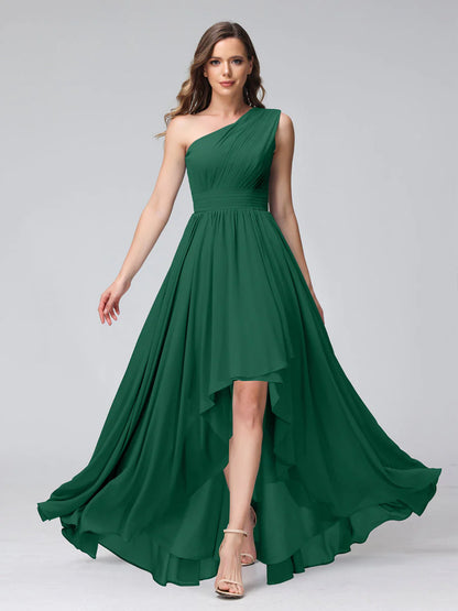 A-Line One-Shoulder Sleeveless Chiffon High Low Bridesmaid Dresses With Pockets