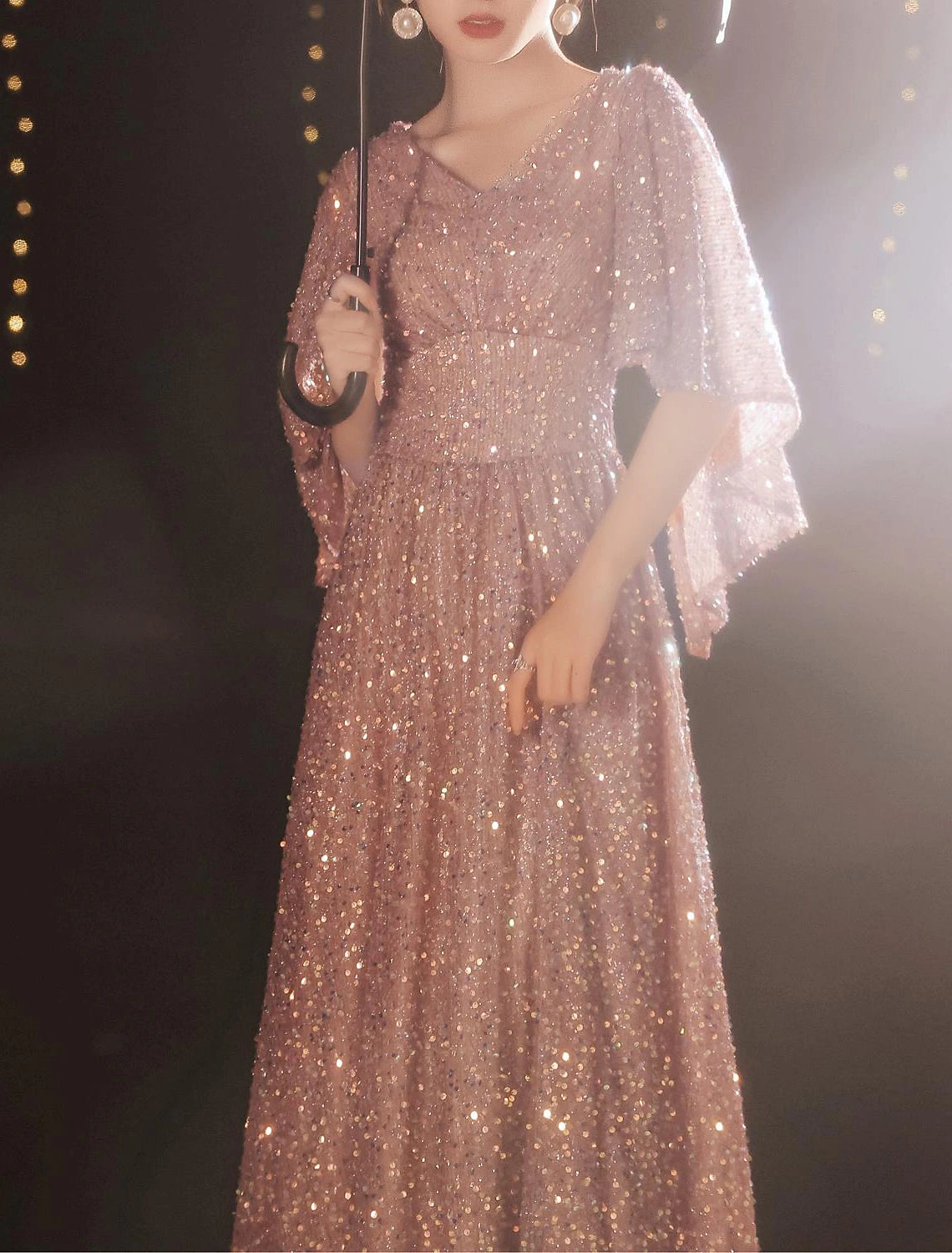 A-Line Party Dress Sparkle Elegant Prom Formal Evening Dress V Neck Half Sleeve Floor Length Satin with Sequin