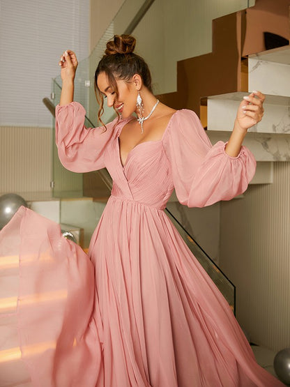 A-Line/Princess 30D Chiffon Ruched V-neck Long Sleeves Floor-Length Dresses