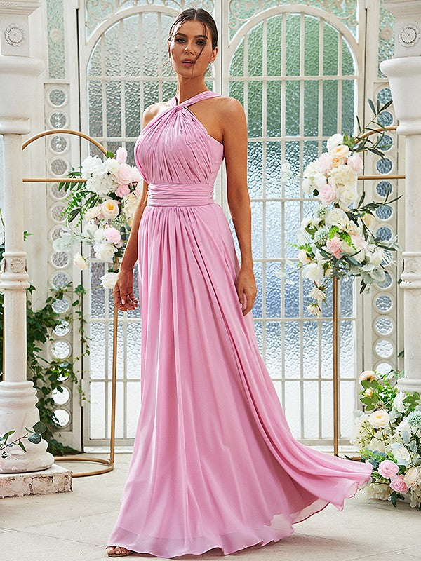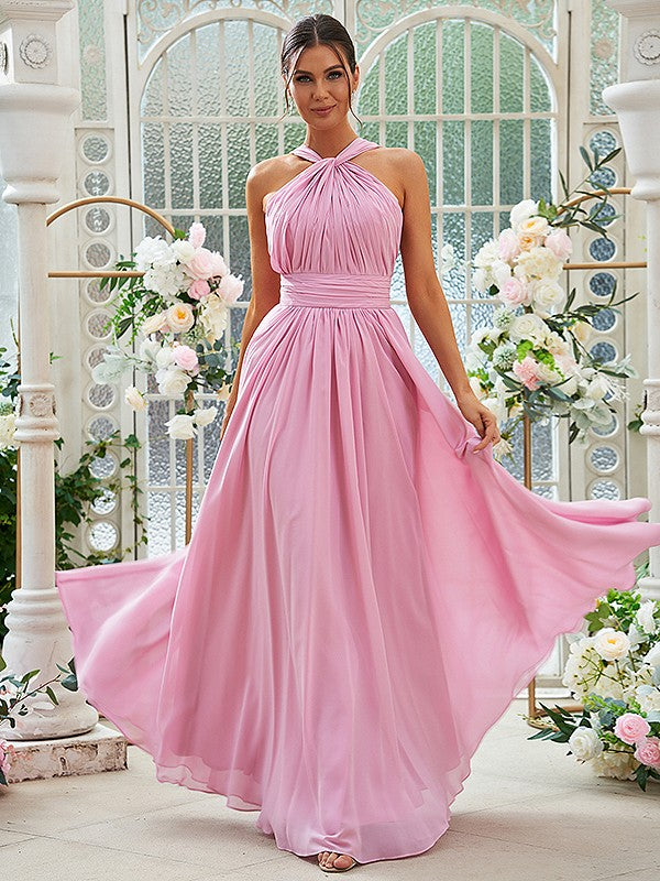 A-Line/Princess Chiffon Ruched Halter Sleeveless Floor-Length Bridesmaid Dresses