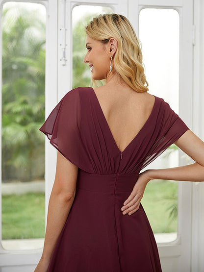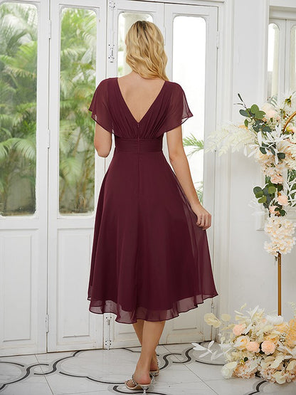 A-Line/Princess Chiffon Ruched Scoop Short Sleeves Asymmetrical Bridesmaid Dresses