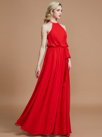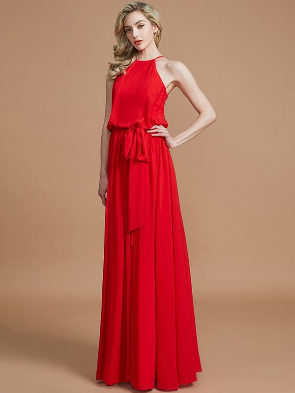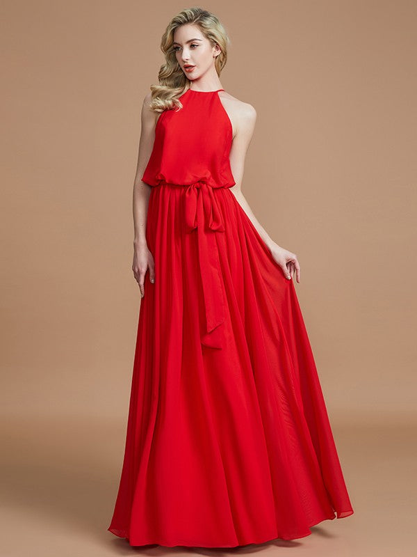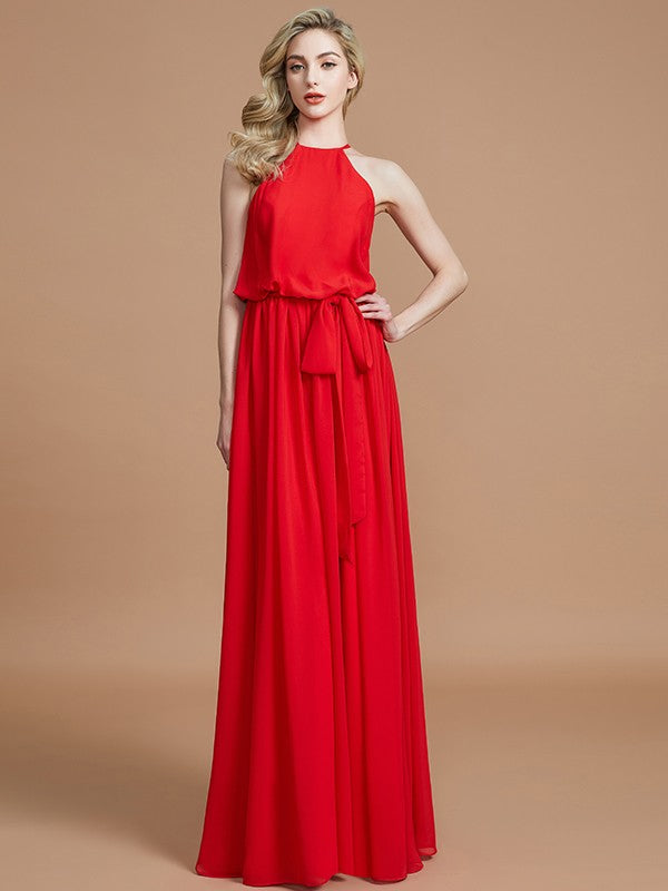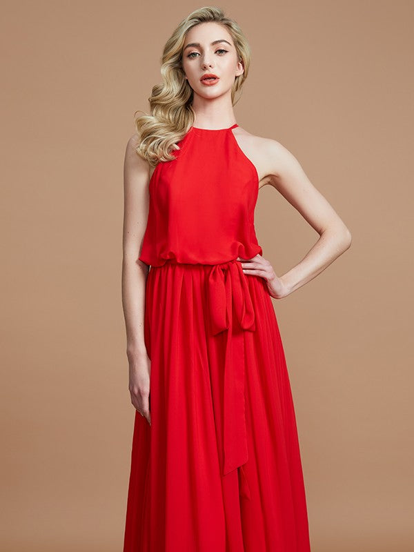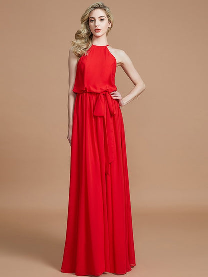 A-Line/Princess Halter Sleeveless Sash/Ribbon/Belt Floor-Length Chiffon Bridesmaid Dresses