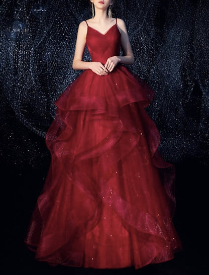 A-Line Sparkle Elegant Sparkle & Shine Engagement Formal Evening Dress Spaghetti Strap Sleeveless Floor Length Tulle with Tier
