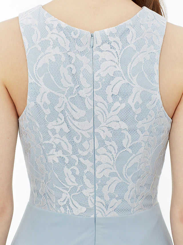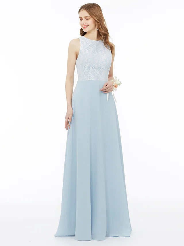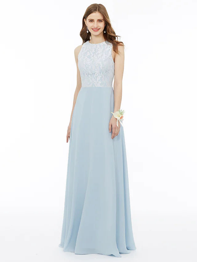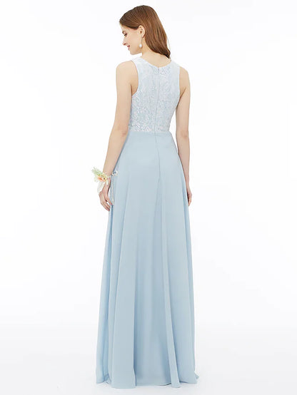 A-Line Bridesmaid Dress Jewel Neck Sleeveless Floor Length Chiffon Metallic Lace with Pleats Draping Appliques