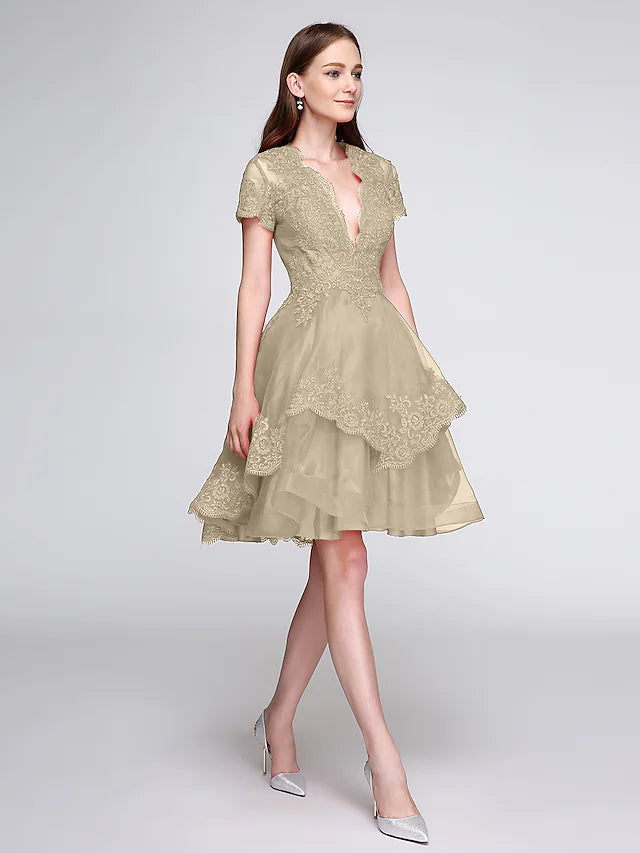 Ball Gown Cute Dress Cocktail Party Knee Length Short Sleeve Plunging Neck Organza with Buttons Appliques