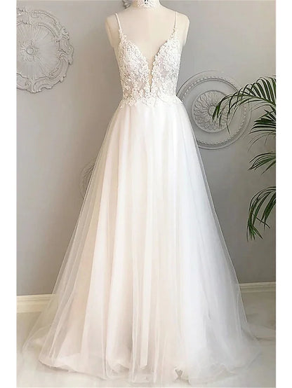 Beach Wedding Dresses Court A-Line Sleeveless Spaghetti Strap Lace With Buttons Appliques