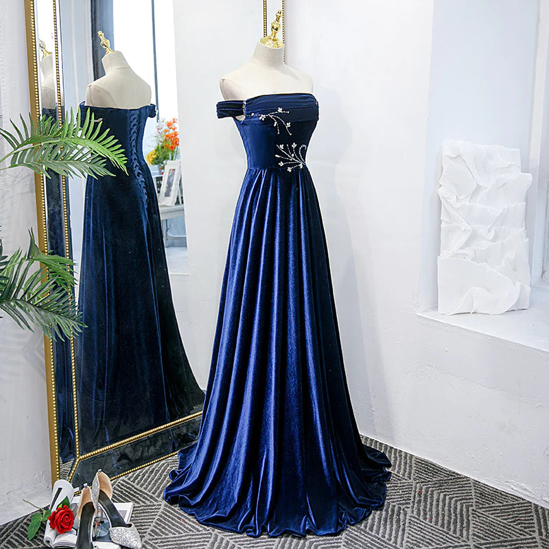 Blue Velvet Beaded Elegant Off Shoulder Evening Dress Blue Long Prom Dress Party Dress