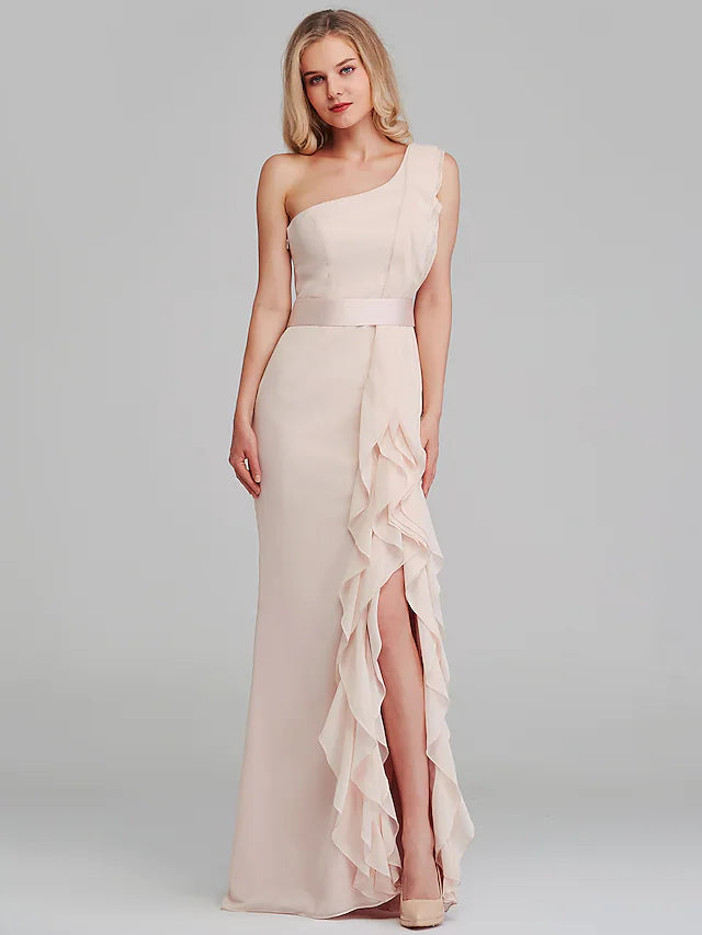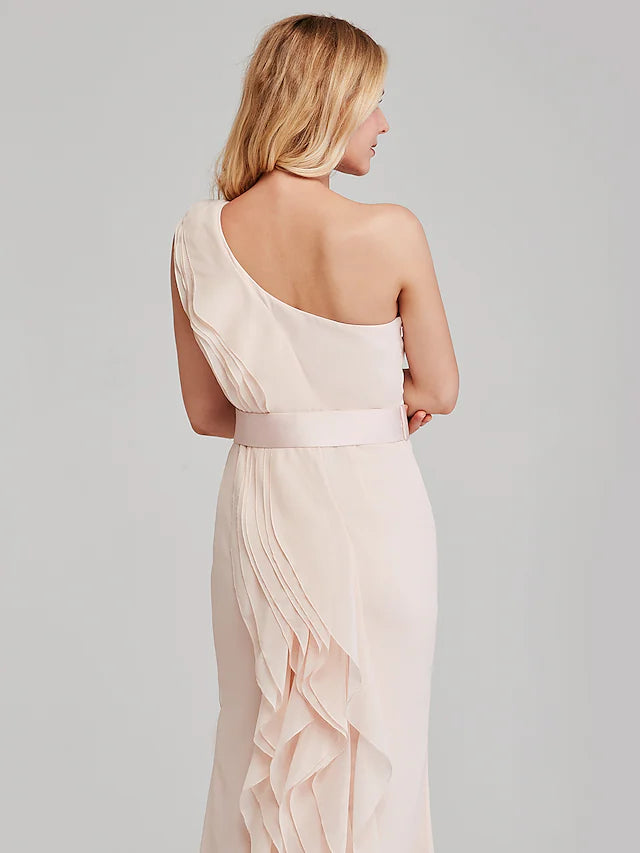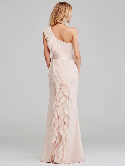 Bridesmaid Dress One Shoulder Sleeveless Elegant Long Length Chiffon with Cascading Ruffles