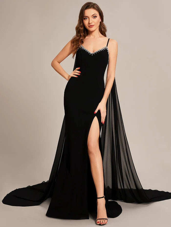 Custom Size Chiffon Streamer Spaghetti Strap High Slit Mermaid Prom Dresses