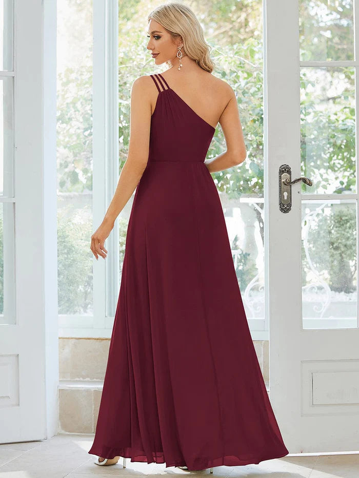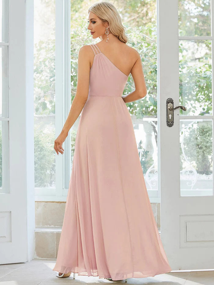 Custom Size Flowy Chiffon One-Shoulder Bridesmaid Dress with Spaghetti Strap