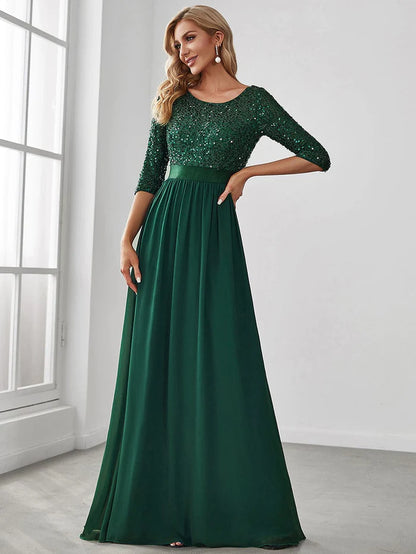 Elegant Round Neckline 3/4 Sleeve Sequins Patchwork Evening Dress