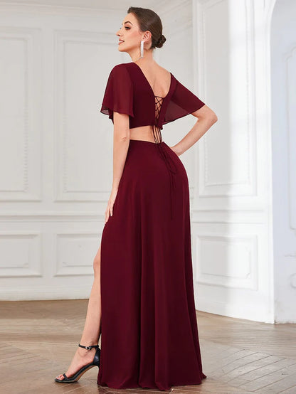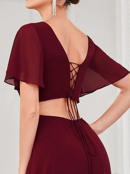 High Slit Flutter Sleeve Lace Up Chiffon Evening Dress