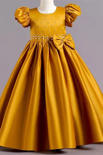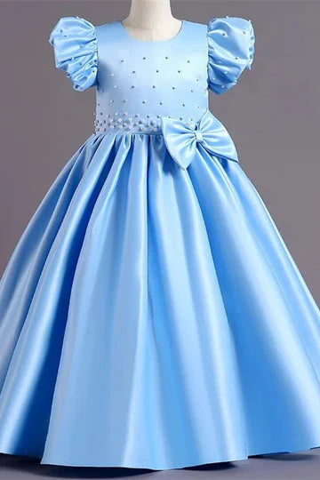 Hot Pink Pearls Puff Sleeve A-Line Girl Party Dress with Bows