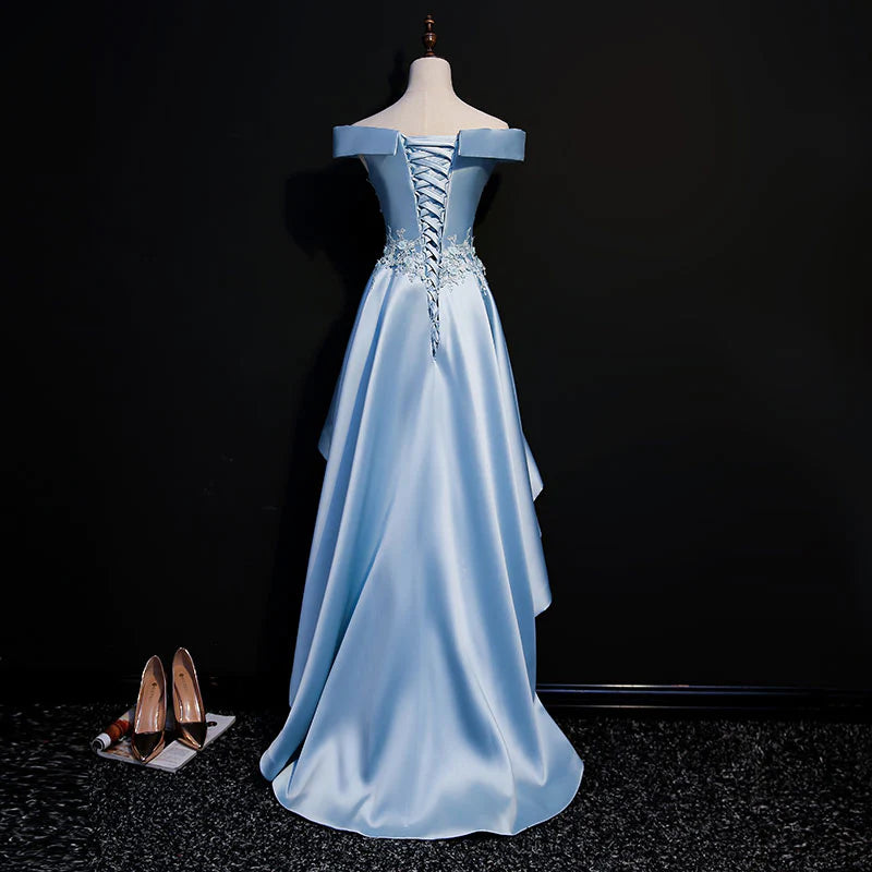 Light Blue Satin with Lace Applique High Low Homecoming Dress, Blue Short Off Shoulder Formal Dress