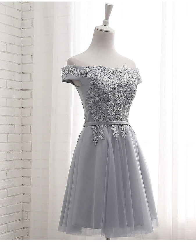 Lovely Grey Short Tulle Party Dress with Lace Applique, Bridesmaid Dresses Cute Formal Dress