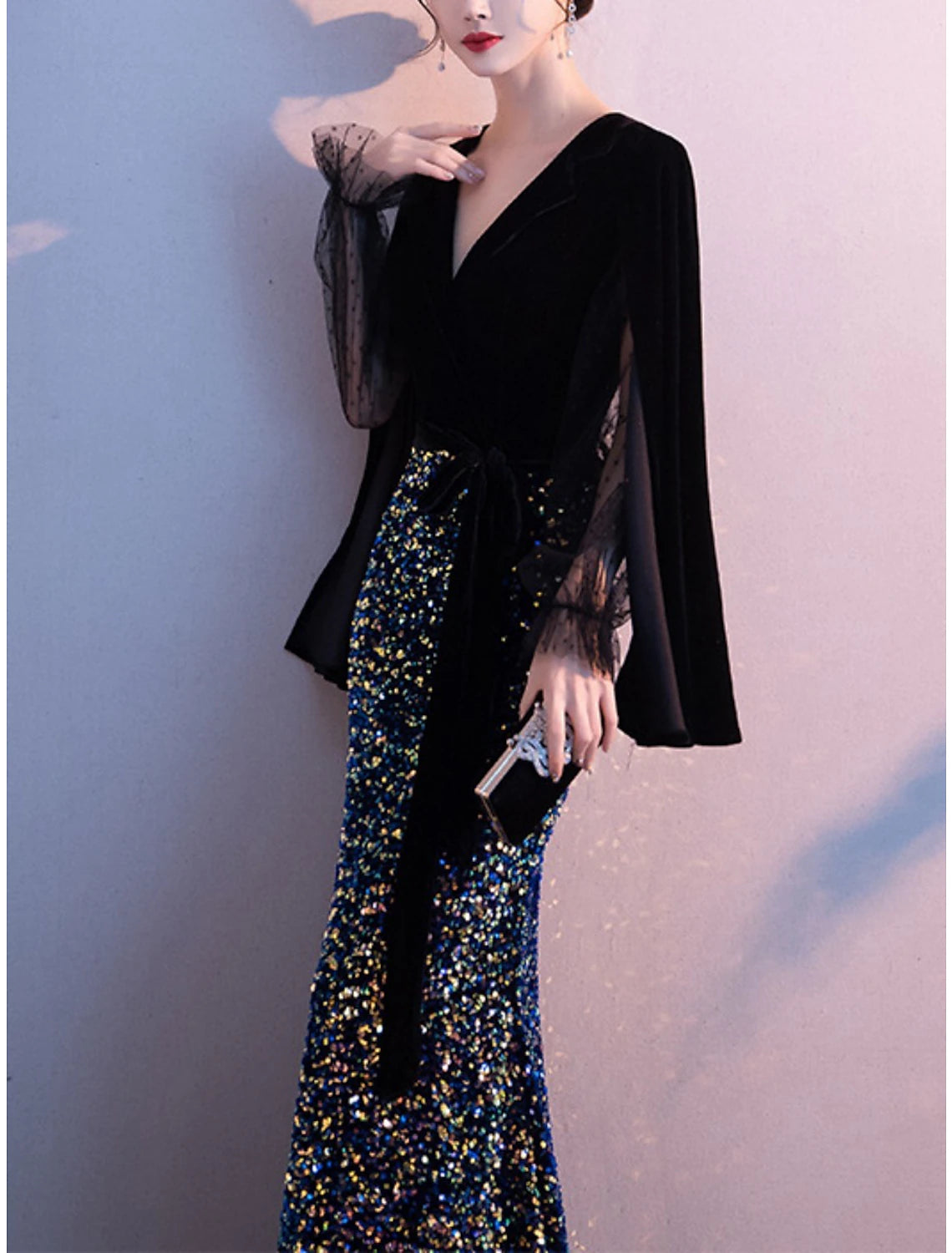 Mermaid / Trumpet Mother of the Bride Dress Party Sparkle & Shine Petite V Neck Floor Length Tulle Sequined Velvet Long Sleeve with Bow(s)