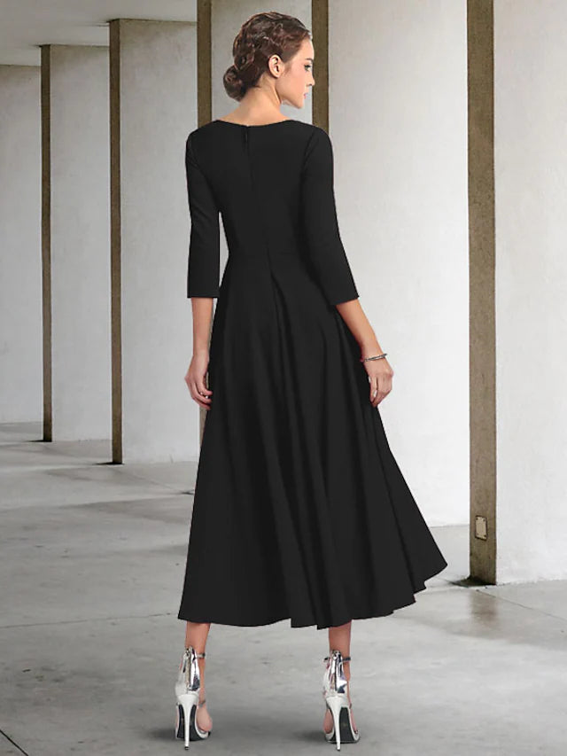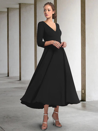 Mother of the Bride Dress Elegant V Neck Tea Length Chiffon Length Sleeve with Pleats