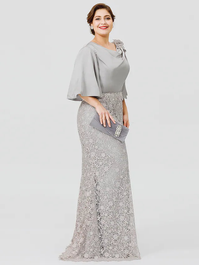 Mother of the Bride Dress Plus Size Sexy Cowl Neck Sweep Brush Train Satin Chiffon Lace Over Satin Half Sleeve No with Applique