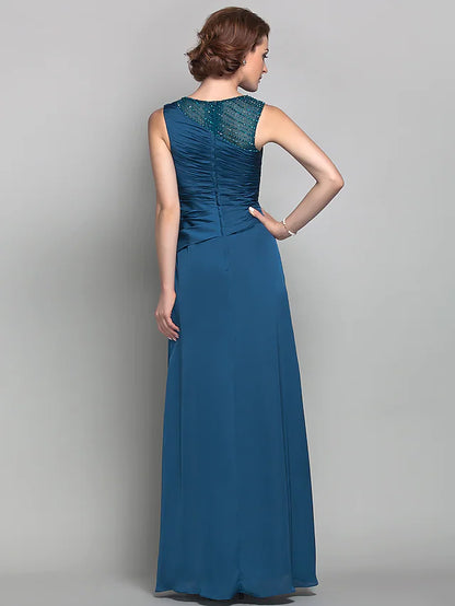 Mother of the Bride Dress Vintage Inspired Jewel Neck Floor Length Satin Chiffon Sleeveless with Beading