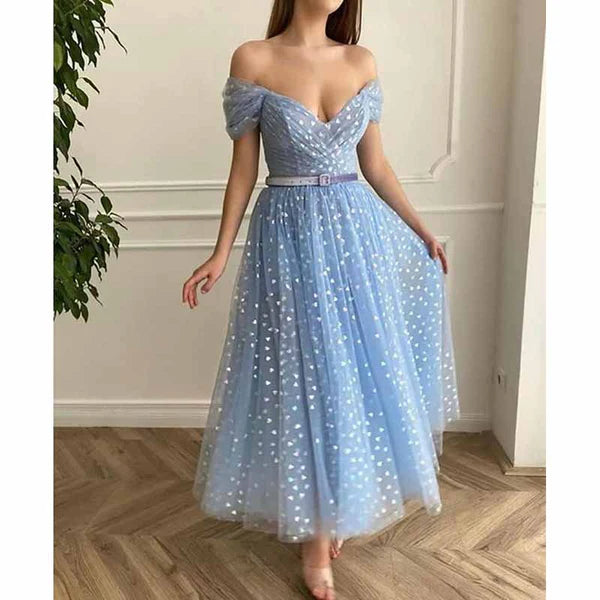 Off Shoulder Tulle Homecomng Dress Tea Length Formal Dress Party Gowns with Belt