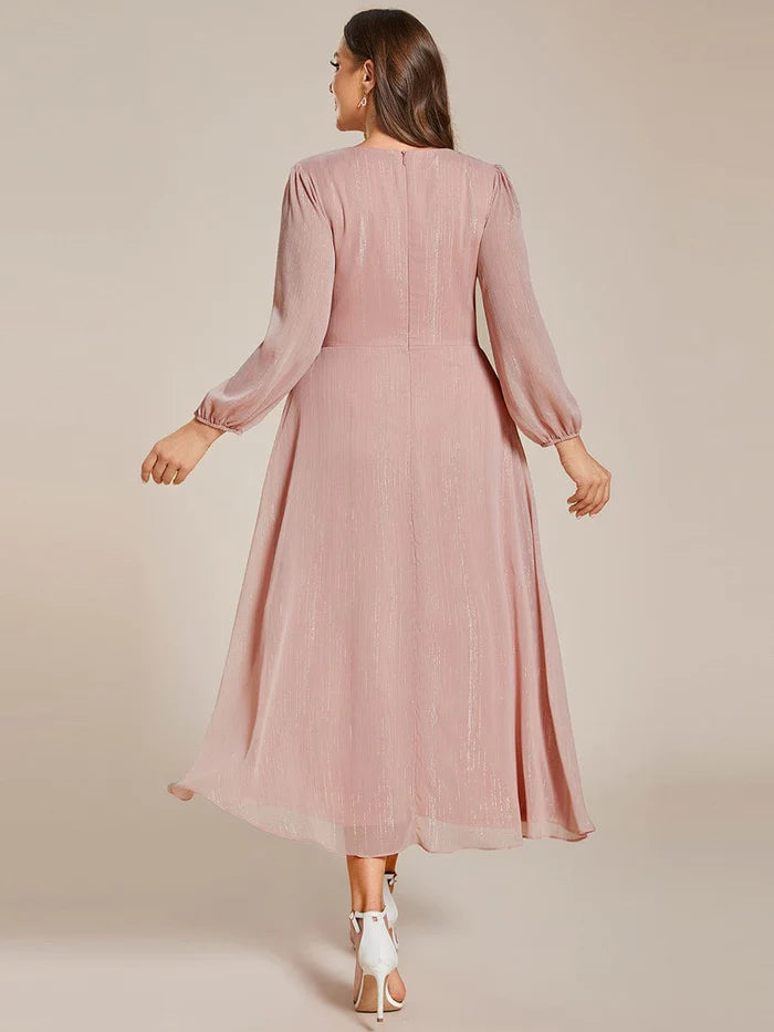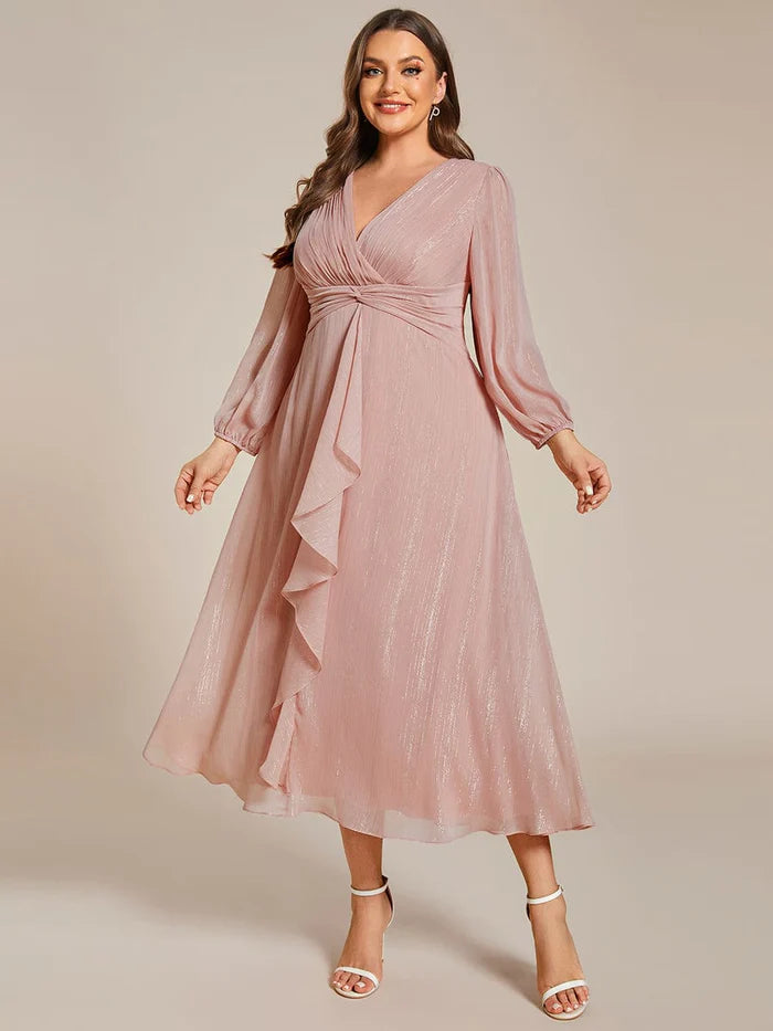 Plus Size Long Sleeve V-Neck Chiffon Twist Knot A-Line Evening Dress