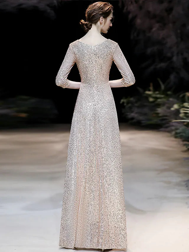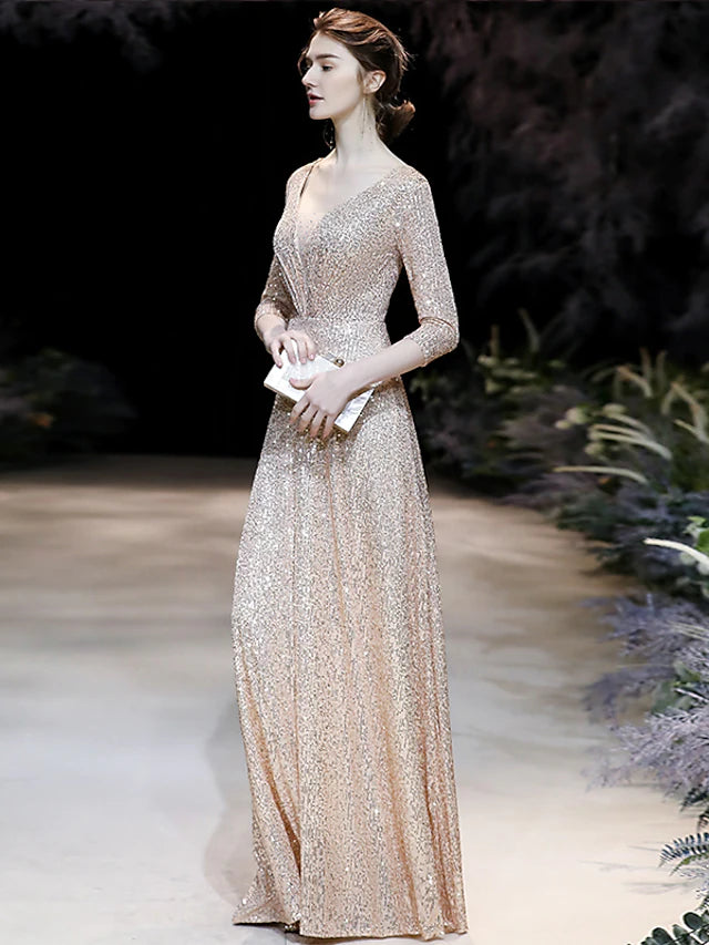 Prom Dresses Sparkle Dress Engagement Floor Length Length Sleeve V Neck Sequined with Pleats Sequin
