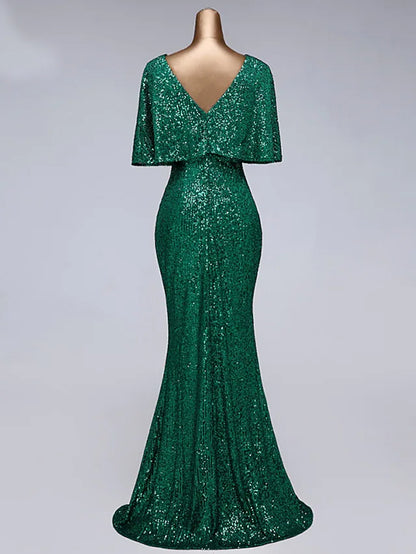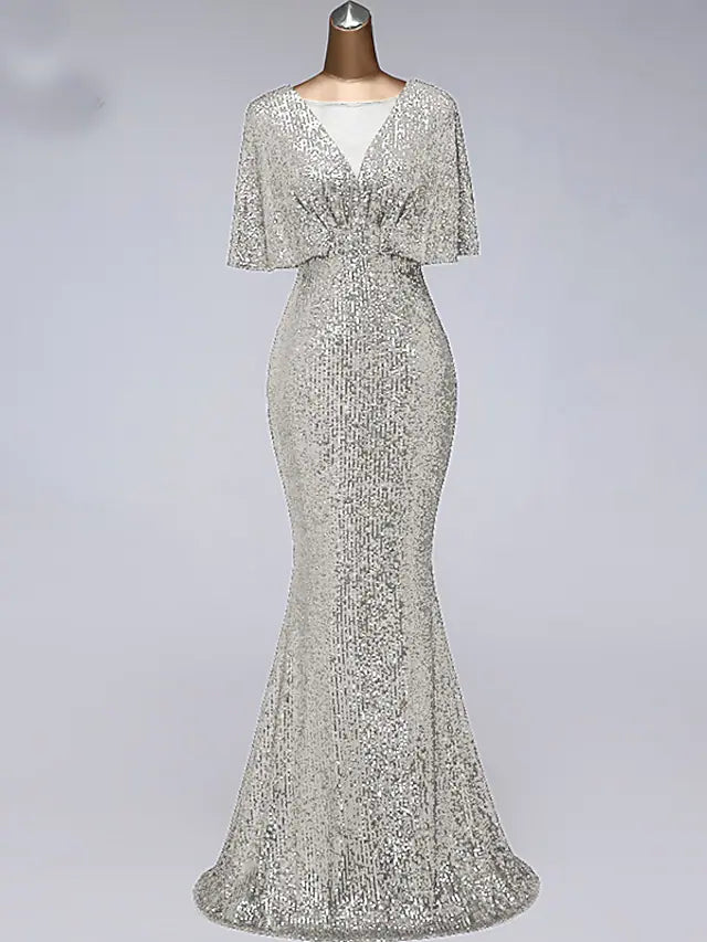 Prom Dresses Sparkle Dress Wedding Guest Floor Length Half Sleeve Illusion Neck Sequined with Sequin Ruffles