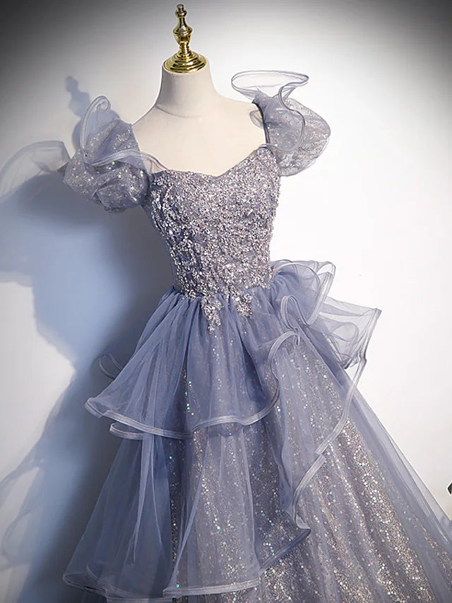 Quinceanera Dresses Princess Dress Performance Floor Length Short Sleeve Square Neck Tulle with Crystals Ruffles