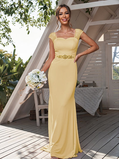 Sheath/Column Jersey Rhinestone Square Sleeveless Sweep/Brush Train Bridesmaid Dresses