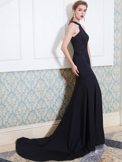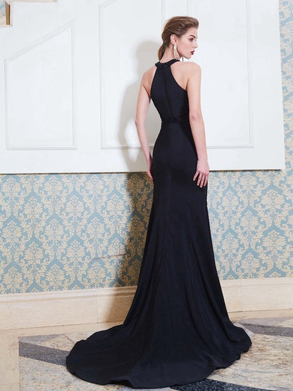 Sheath/Column Jewel Sleeveless Sweep/Brush Train Beading Elastic Woven Satin Dresses