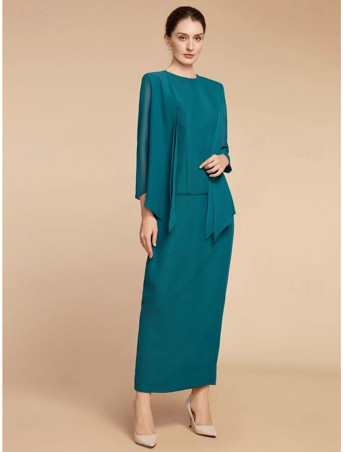Sheath / Column Mother of the Bride Dress Wedding Guest Elegant Simple Jewel Neck Ankle Length Chiffon Long Sleeve with Split Front Ruching Solid Color