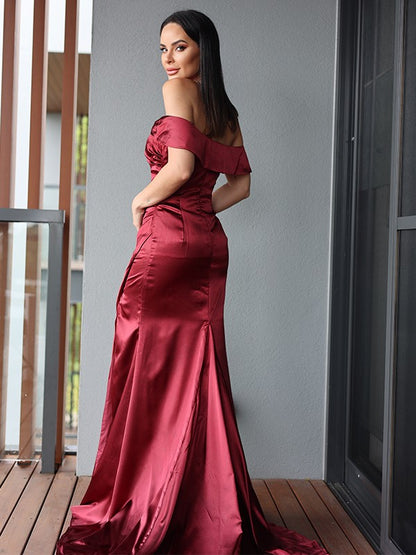 Sheath/Column Satin Ruched Off-the-Shoulder Sleeveless Sweep/Brush Train Dresses