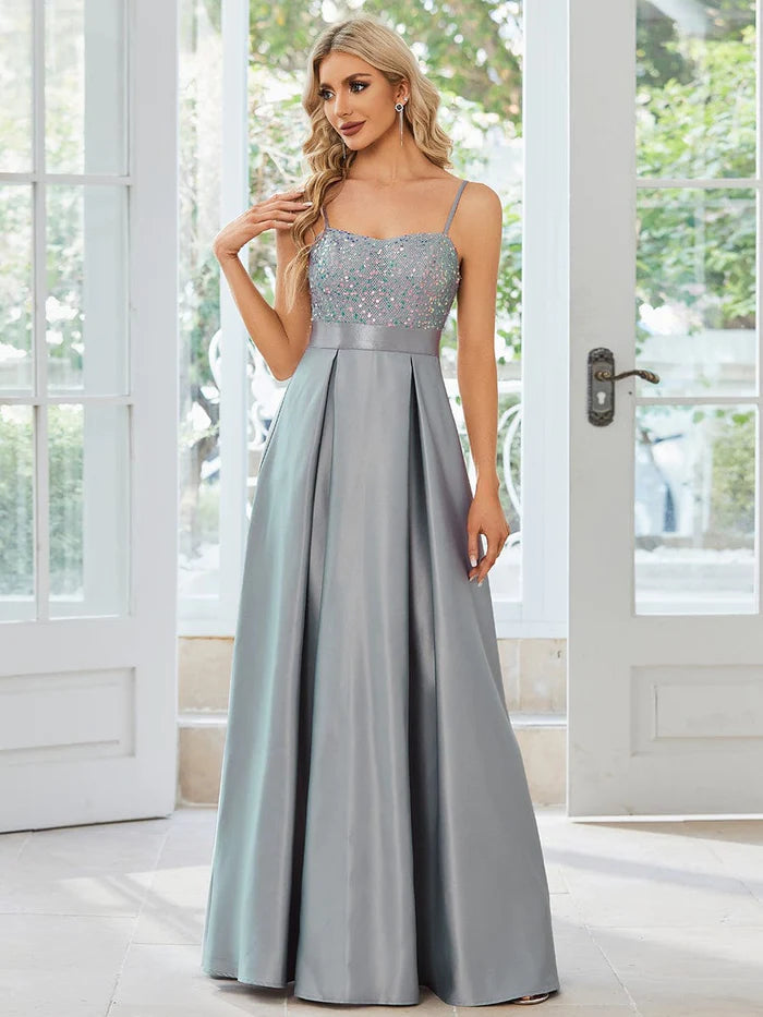Spaghetti Strap Sequin Bodice A-Line Satin Prom Dress