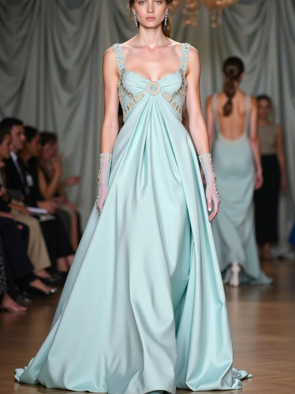 Square Neck Mint Satin Prom Dresses with Beaded Embroidery and Empire Waist